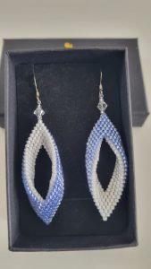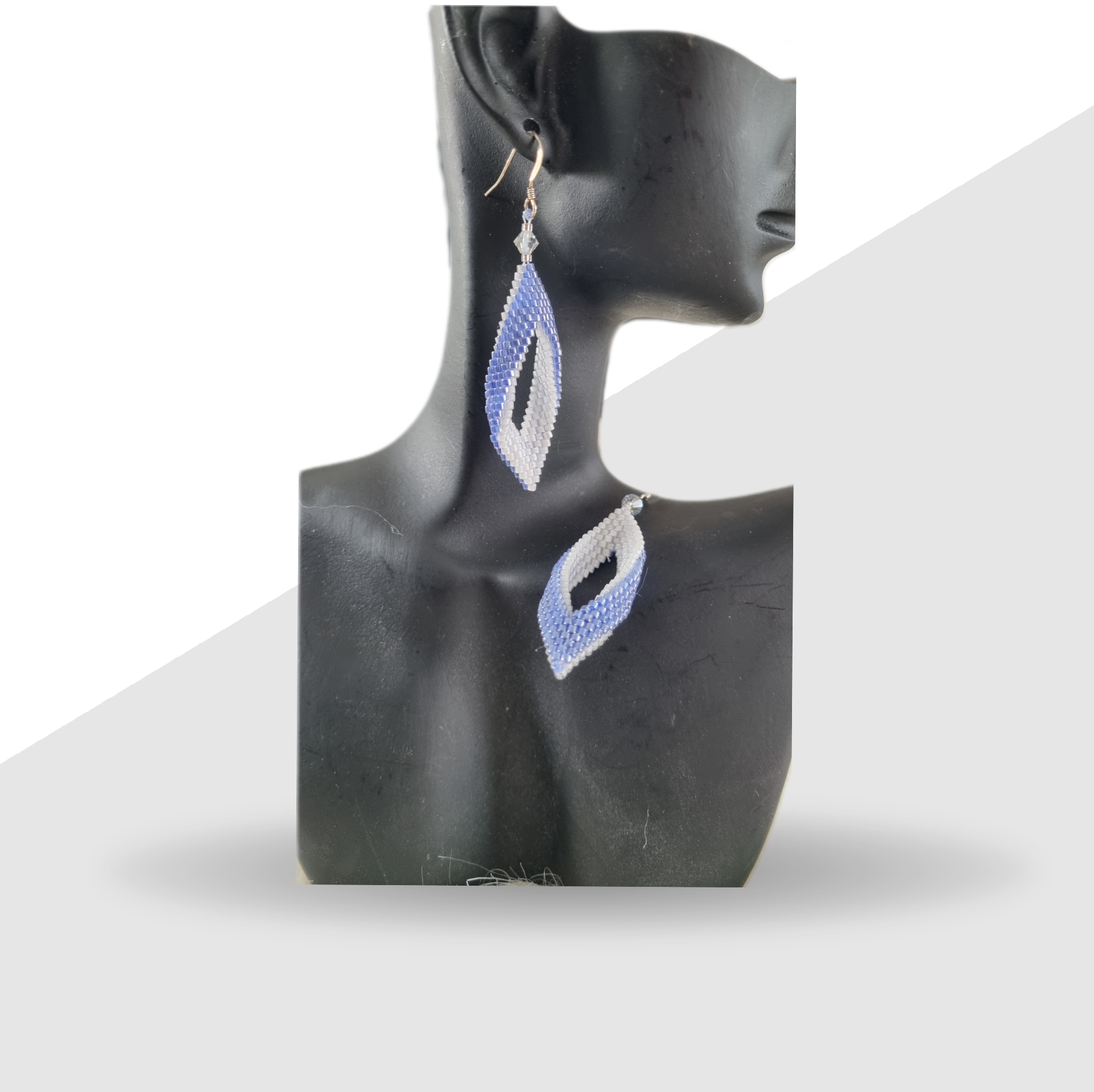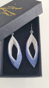 Ces boucles élégantes sont composées de perles Miyuki tissées en forme de feuilles allongées. Le dégradé du blanc perlé vers un bleu azur donne un effet tout en finesse. Elles sont agrémentées de perles transparentes facettées pour un éclat discret mais raffiné.
