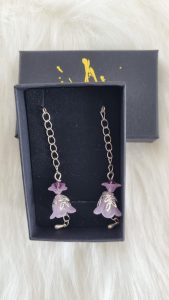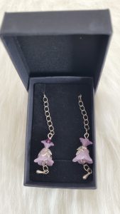Ces boucles d’oreilles florales seront parfaites pour vos tenues d’été. Elles forment de petites clochettes rose pâles, surmontées de petites fleurs lilas clair et d’une petite perle ronde mauve. Le tout est suspendu à des chaînettes en acier inoxydable, se terminant par une petite goute.