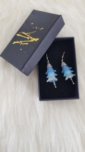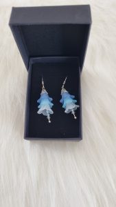 Boucles florales en lucite avec un dégradé de couleurs allant du bleu au blanc. Agrémentées de petites perles intérieures rappellant le pistil.