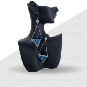 Deux triangles turquoise suspendus à une fine chaîne argentée et ornés de perles nacrées. Légères et modernes, ces boucles rappellent la fraîcheur d’un ciel d’hiver ou la lumière dansante des aurores boréales.