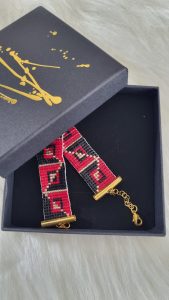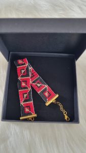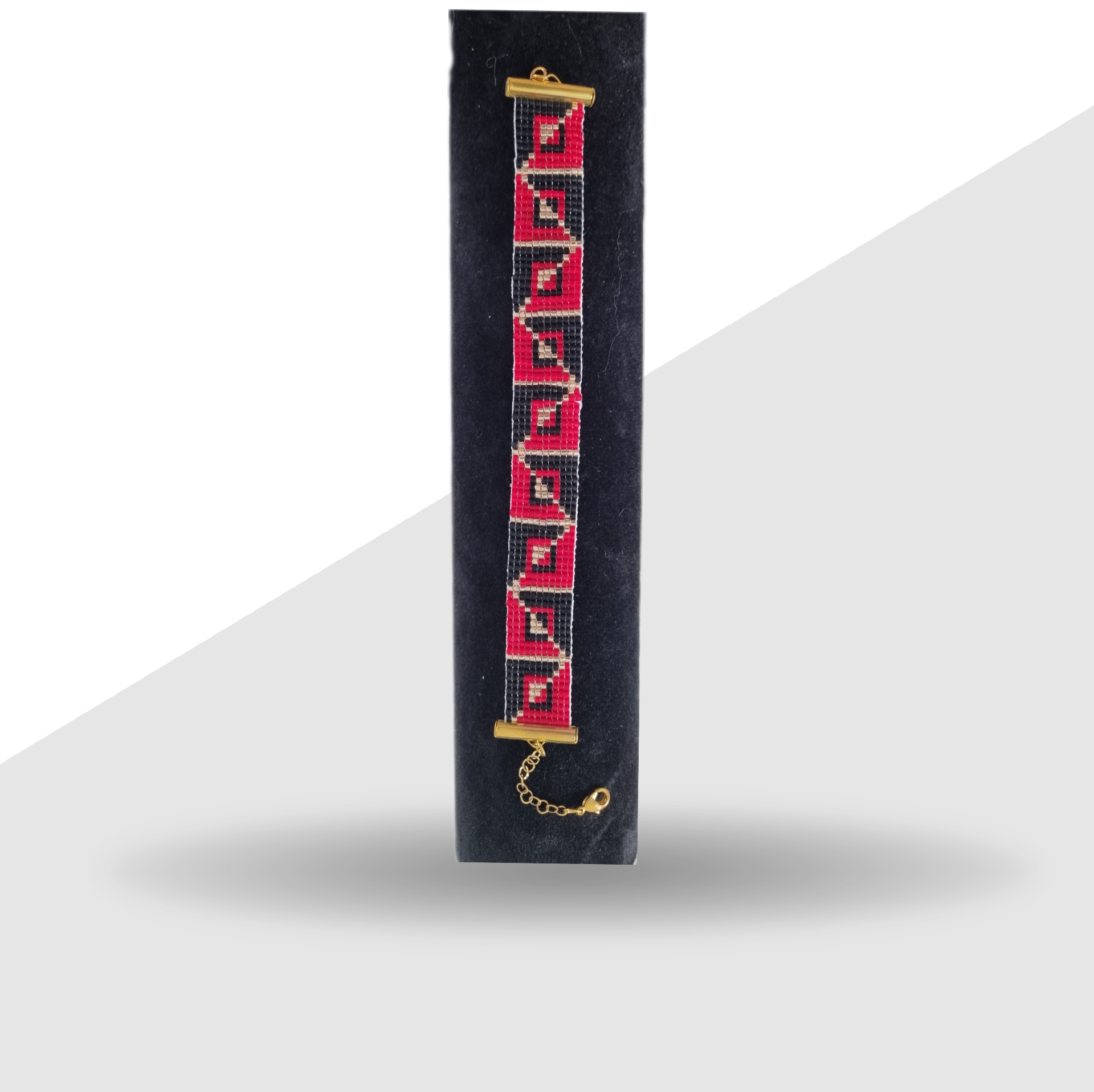 Ce bracelet rappelle les cases d’un damier. Fait main en perles Miyuki rouge, noir et doré. Le Bracelet est réglable selon la taille de votre poignet. Fermoir mousqueton en acier inoxydable.