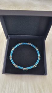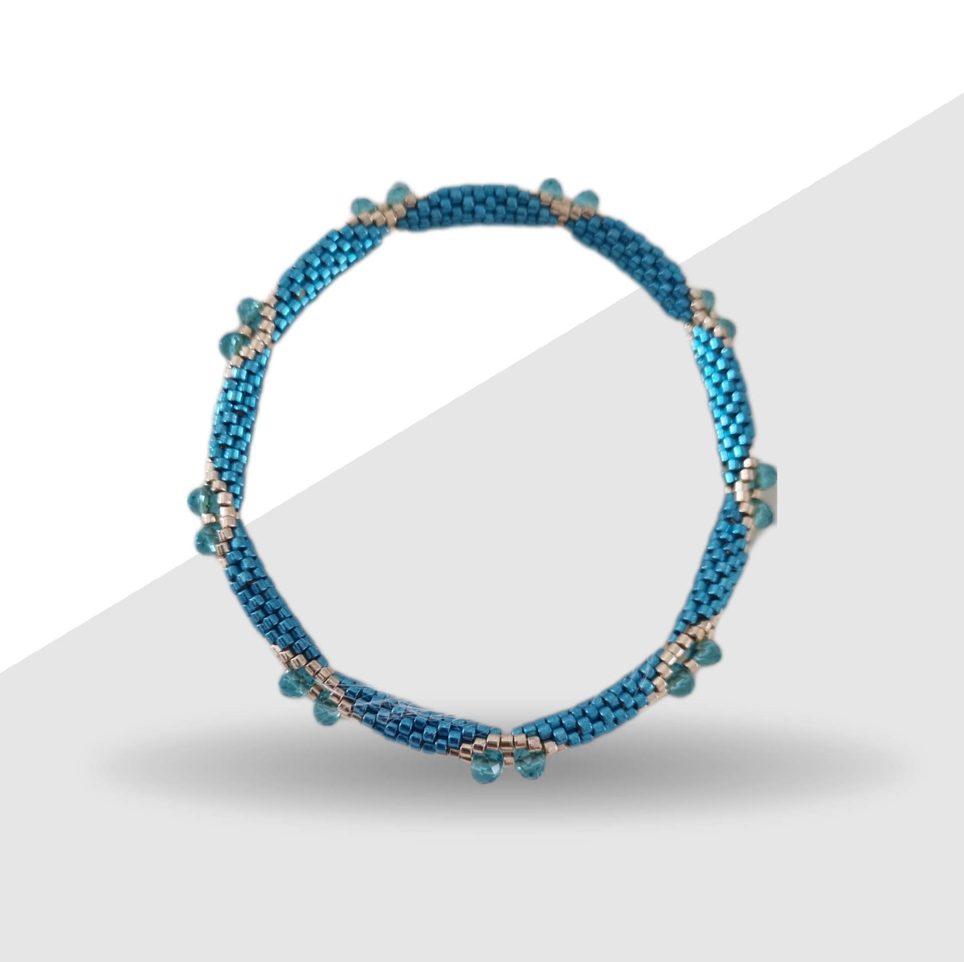 Ce bracelet circulaire rigide est entièrement tissé en perles Miyuki bleu lagon avec un délicat liseré doré. De petites perles de cristal bleu turquoise viennent ponctuer régulièrement le pourtour, ajoutant éclat et élégance au mouvement. Léger et lumineux, il évoque les reflets dansants d’une eau tropicale.