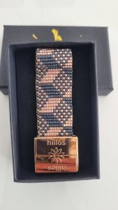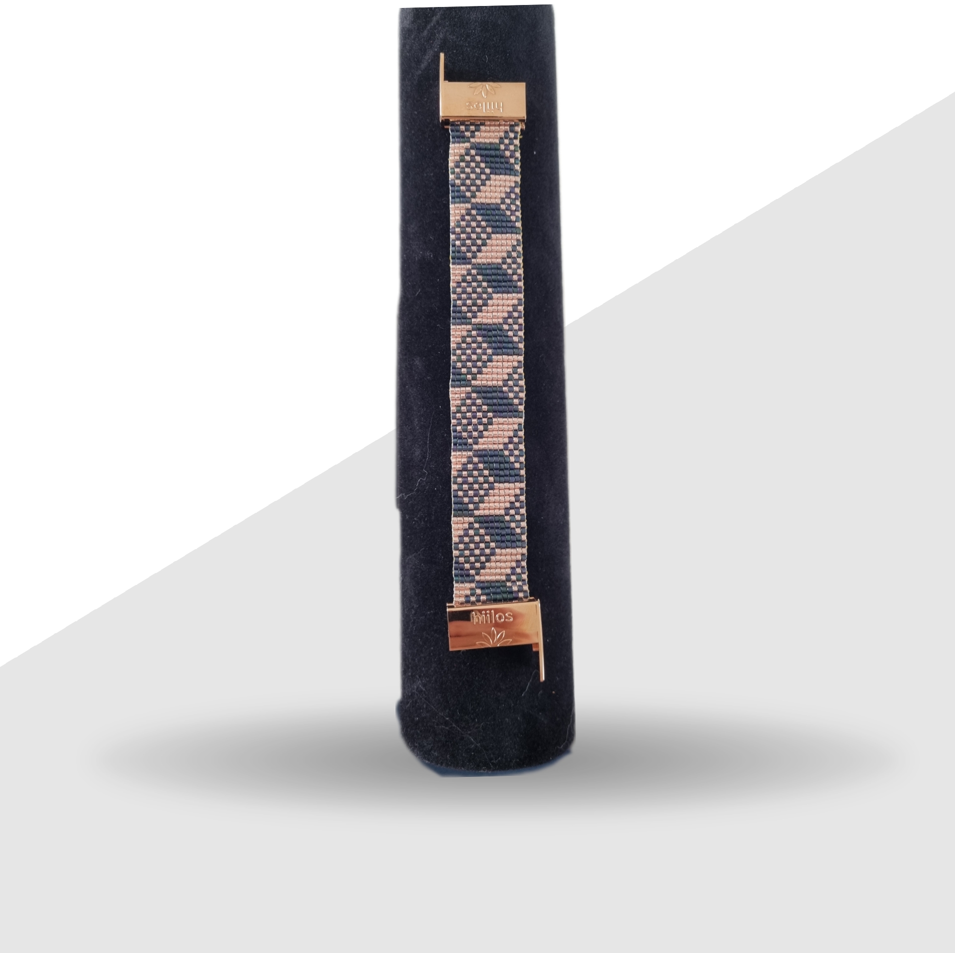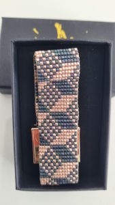 Ce Bracelet évoque des cubes en perspective. Il est composé de perles Miyuki doré rose et gris vert. Enfin son fermoir aimanté Hiilos de couleur doré rose est en acier Inoxydable.
